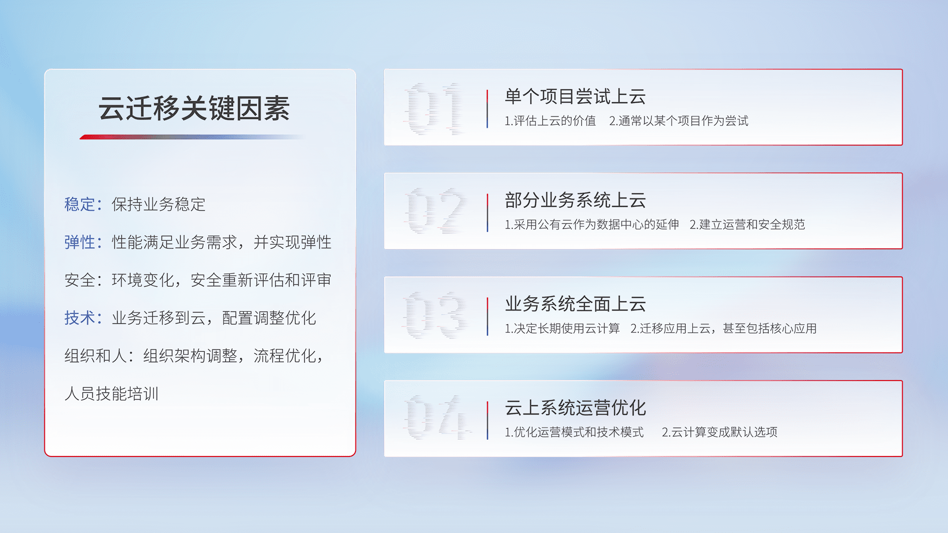 结合实际业务,,,从规划设计、、云平台选型、、、云原生改造、、数据迁移、、、集成交付,,迁移全过程为客户识别最佳上云路径,,,做好风险识别管理,,设计网络架构、、、身份权限、、、、安全审计合规、、、、操作审计、、、日志审计、、、监控告警策略、、、多站点容灾设计等,,,对云上基础设施进行整体规划,,,提升IT治理水平,,,以满足弹性、、、高可用、、高性能的需求。。。